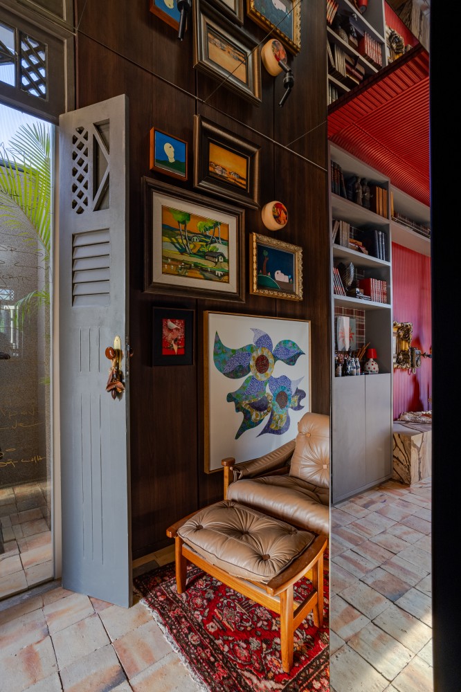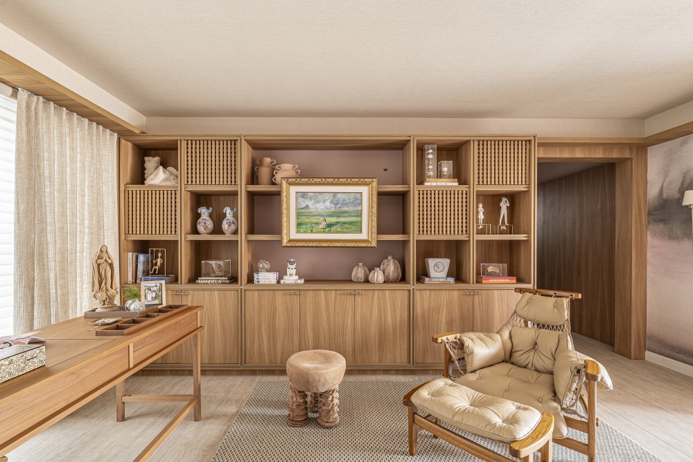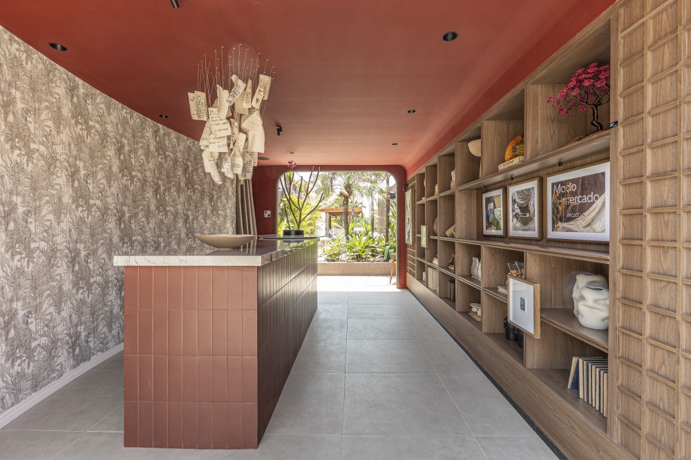 Com um convite ao silêncio e à introspecção, Junior Ordoñez transforma a leitura em rito, com histórias que se entrelaçam a memórias e emoções. O ambiente reverencia os mangues e rios sergipanos, evocando o ecossistema, sua força e delicadeza, através do vermelho vibrante, enquanto o azul traduz a suavidade das águas que moldam o litoral. Obras de arte ampliam a narrativa do espaço, onde a sustentabilidade é uma postura essencial. Piso de cerâmica de queima natural, peças de madeira de demolição e reuso de mobiliário afetivo integram o projeto e reafirmam que beleza e consciência devem caminhar juntas. Os painéis do espaço, são todos com o Nogueira Açaí, e prateleiras no MDF Asfalto.