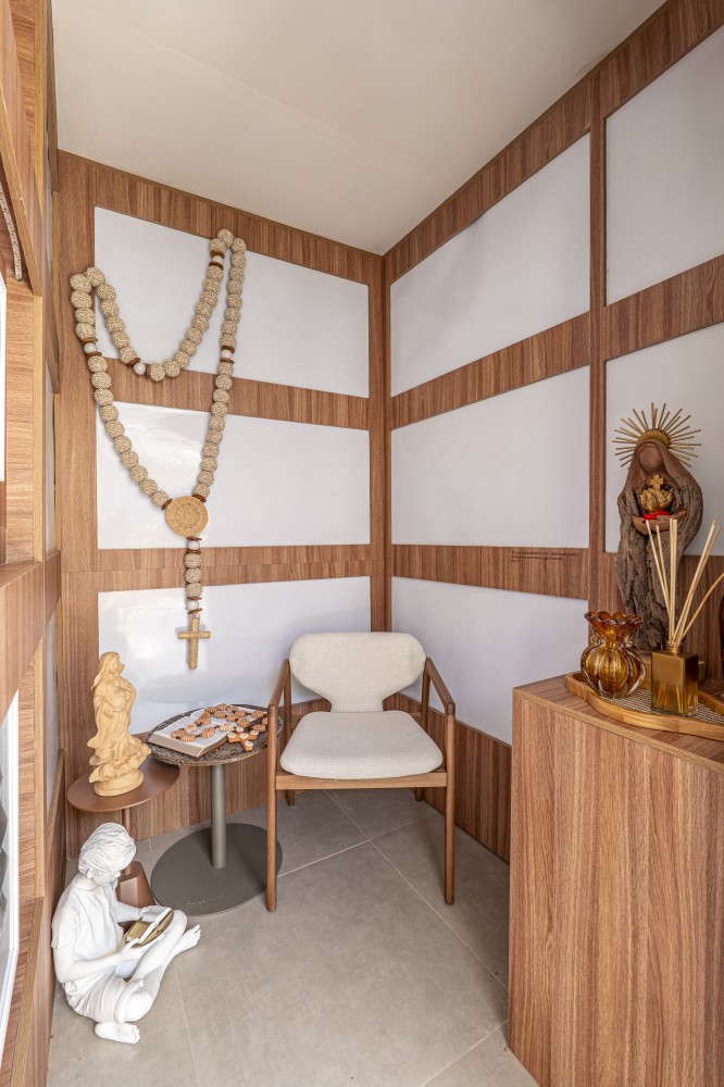 A proposta do living é uma jornada em três momentos — encontro, partilha e recolhimento no Auterium, espaço de introspecção, silêncio e oração, voltado à conexão com o sagrado. Inspirado por sua vivência monocular, o arquiteto concebeu um ambiente usando o MDF Camapu, que articula aromas, texturas e Braille, ampliando a experiência para além da visão. Inserido no conceito de outdoor living e em contato direto com a natureza, o espaço propõe a arquitetura como mediadora da espiritualidade.