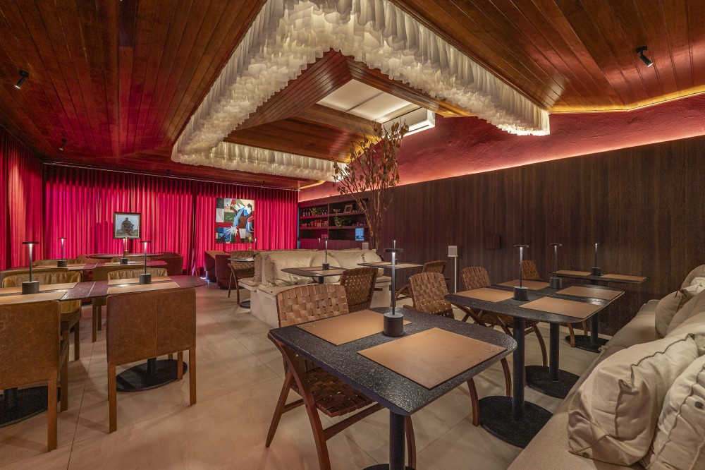 Inspirado no glamour dos anos 1940, época da inauguração do Palácio de Veraneio, o espaço gastronômico foi reinterpretado com uma linguagem contemporânea e intimista. A paleta bordô e os materiais nobres, como o couro natural, madeira escura Nogueira Açaí e iluminação em tecido, criam uma atmosfera envolvente e acolhedora. Ao unir memória e atualidade, o ambiente traduz o tema da mostra com sofisticação, pertencimento e intensidade sensorial.