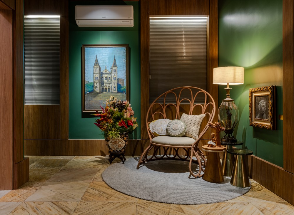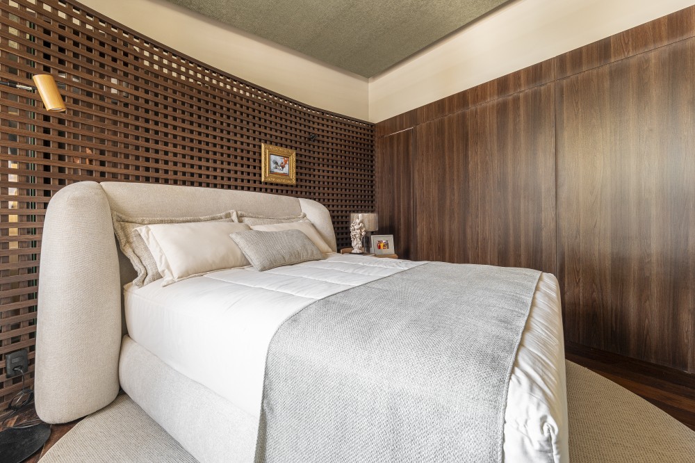 Com 15,35m2, o espaço de descanso traduz as raízes sergipanas em harmonia com o contemporâneo. O painel com o Nogueira Açaí em muxarabi curva-se para integrar cabeceira e armário, enquanto obras de artistas, como Jenner, Lucivaldo e Deise Oliveira, reforçam a identidade local. Tecidos naturais, madeira e iluminação aconchegante completam o espaço que semeia memória e sonhos.